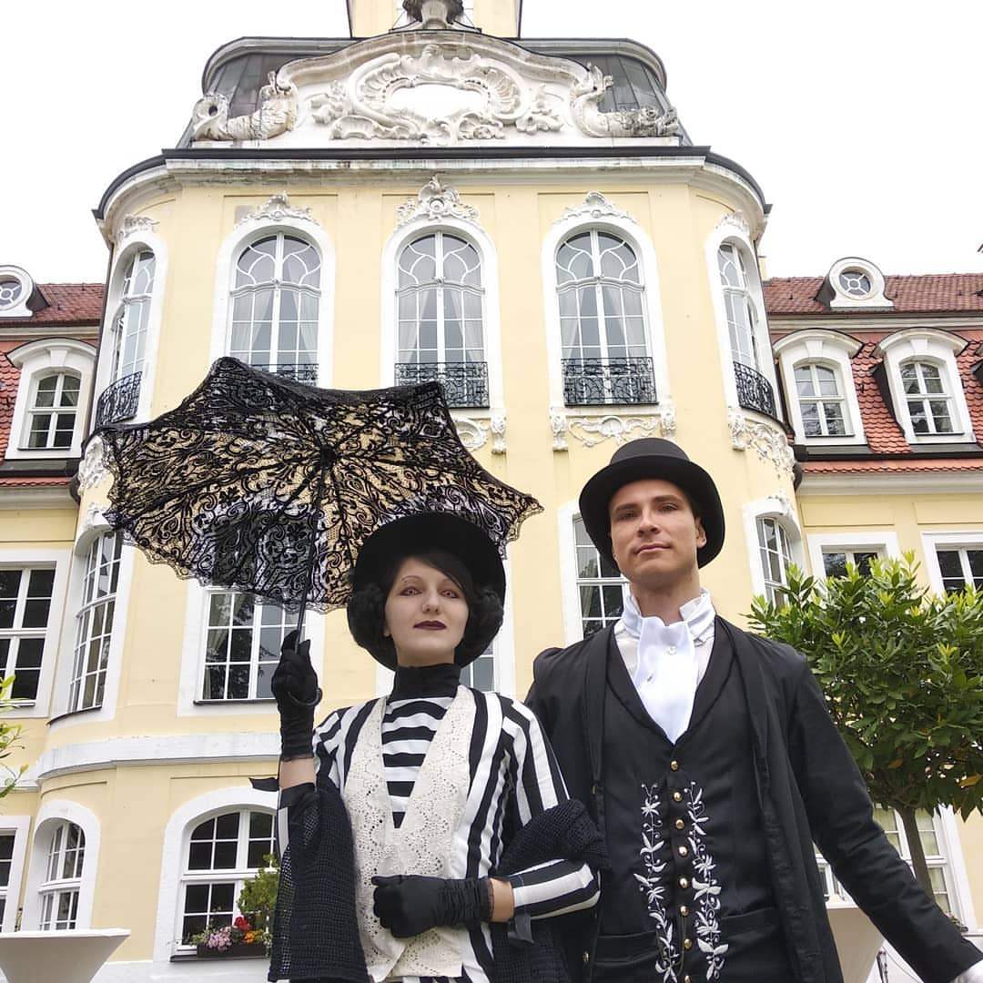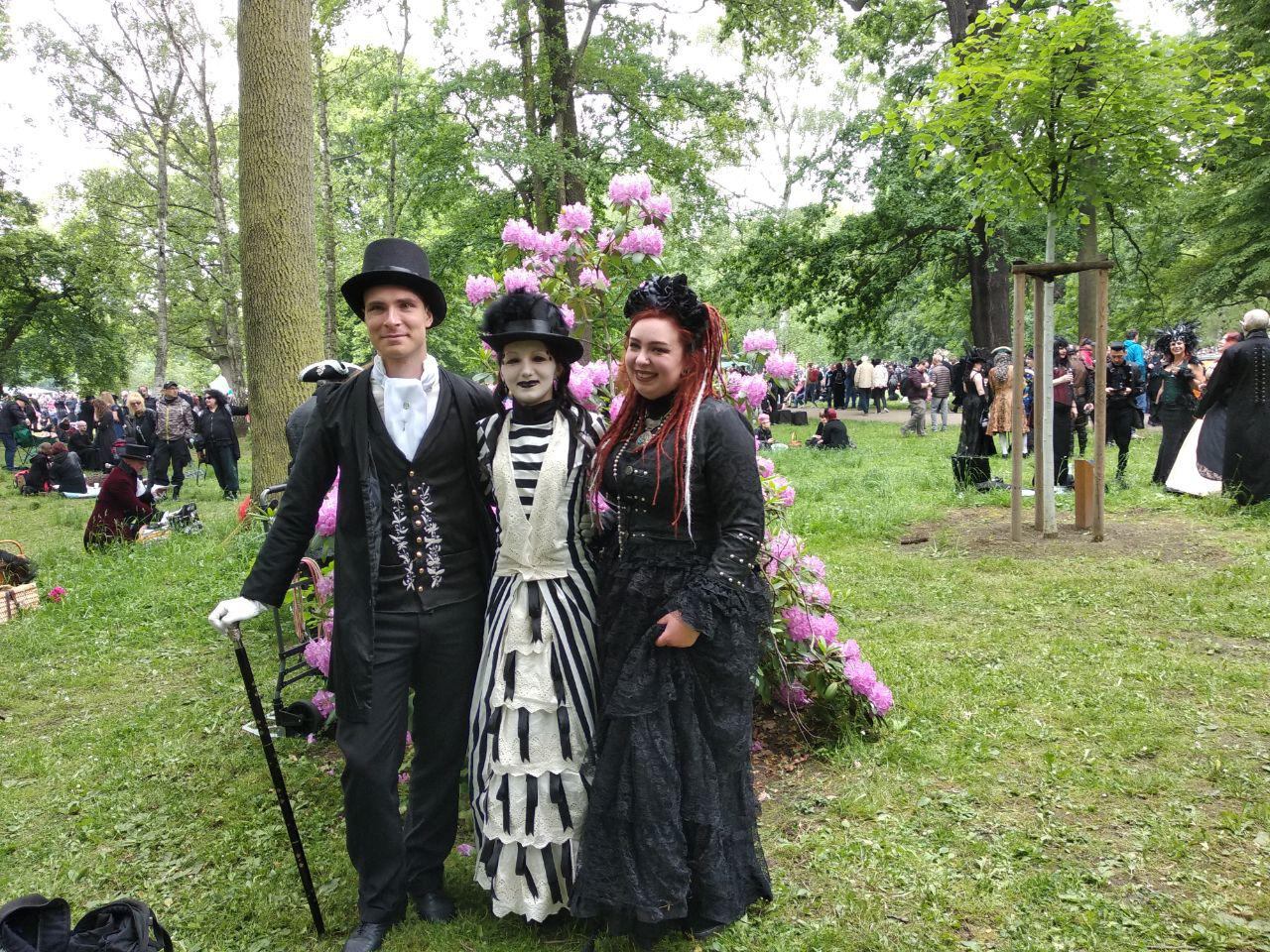 Friday. Our day began with Victorian picnic in Clara Zetkin park. It’s unofficial, but really popular event. More than that, I discovered that there would be a concert of Goethes Erben. So I put my Victorian dress, a hat with feathers, took my lace umbrella and knitted skeleton (I’ve made all of this by myself) and went to the park. It was cloudy and quit cold, that’s why we’ve got really gloomy photos and our skin didn’t suffer because of sun. We watched a concert with piano and met our friends. Then we went to other part of the park. There were a lot of people (it was said that there were about 3000 guests during the picnic), that’s why it was difficult to find quite place. Finally we sat down near Rhododendron and had a meal. This event finished at 6 p. m., but we all wanted to visit some concerts, so we went at 5 p. m.