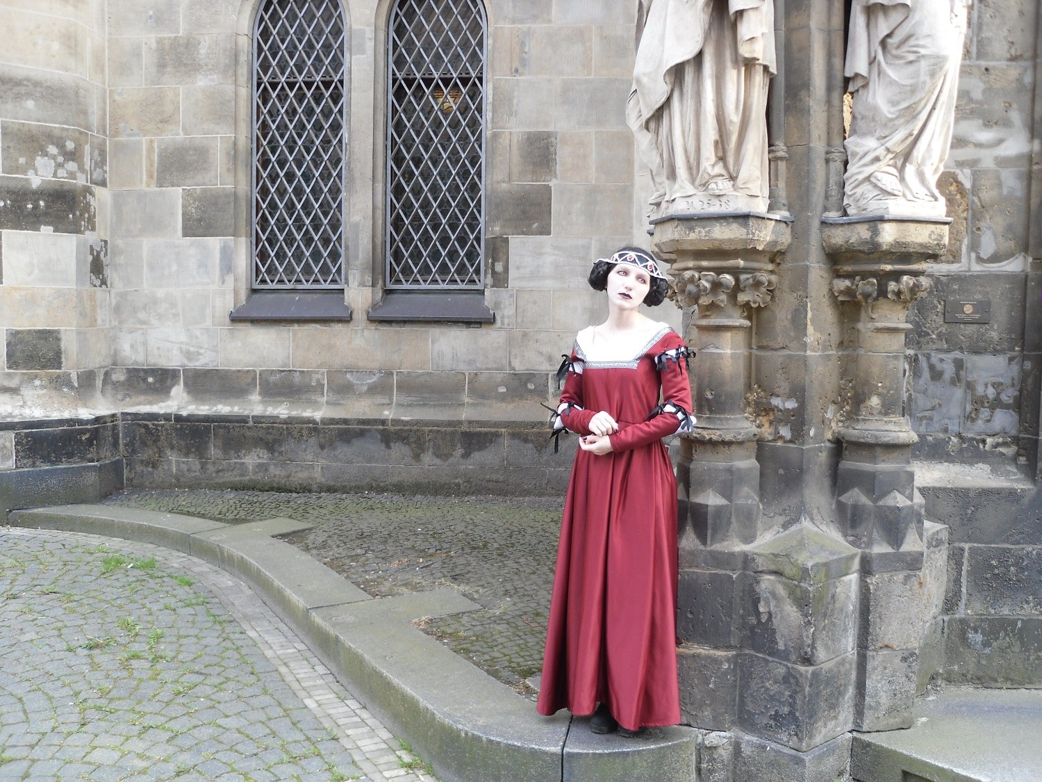 Saturday. I had to wake up early, because I wanted to visit Victorian Village, which started to work at 10 a. m. I put on my Victorian dress once again and went there. It was also unofficial event, but organizers rented a mansion, which looked fantastic. There were lovely courtyard with a fountain, statues and tables and gallery with paintings and handmade. Organizers invited some bands, but we hadn’t enough time to watch their concerts. We just had a rest there about 2,5 hours and played cards. Then we went to the hotel, where I changed my clothes. I put on my Renaissance dress, which I’ve also made by myself, because we were going to visit a festival of music of the Middle Age and the Renaissance.